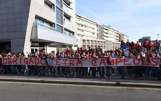 Em pólos opostos estiveram também os axadrezados...enquanto os seus dirigentes resolveram impedir os adeptos do Benfica de entrarem com cachecóis e adereços do Maior de Portugal...lá em baixo no relvado os jogadores dignificaram a festa de consagração fazendo guarda de Honra na entrada dos jogadores encarnados em campo.Assim se fecha o Campeonato! O #36 conquistado e em beleza comemorado com um empate no Bessa que faz recordar outro que ali abriu caminho a explosão de alegria de Campeão!